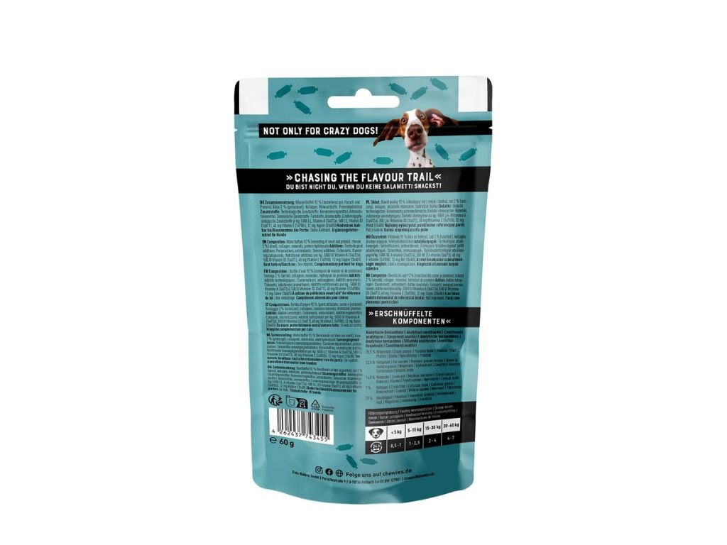 Salametti jsou malé salámky s intenzivní masovou chutí a vůní, které si váš mazlíček zamiluje! Jsou vyrobeny z přírodních surovin, šetrně sušených vzduchem, obsahují velký podíl masa (hovězí a sobí) a nenajdete v nich obiloviny ani přidaný cukr. Snadno je nalámete na menší kousky, což z nich dělá ideální tréninkový pamlsek a odměnu. Pochutnají si na nich pejsci všech věkových kategorií, přičemž díky vysokému obsahu proteinu a kolagenu jsou perfektní volbou i pro aktivní psy, kterým dodají potřebnou energii, ať na tréninku nebo jen cestách.