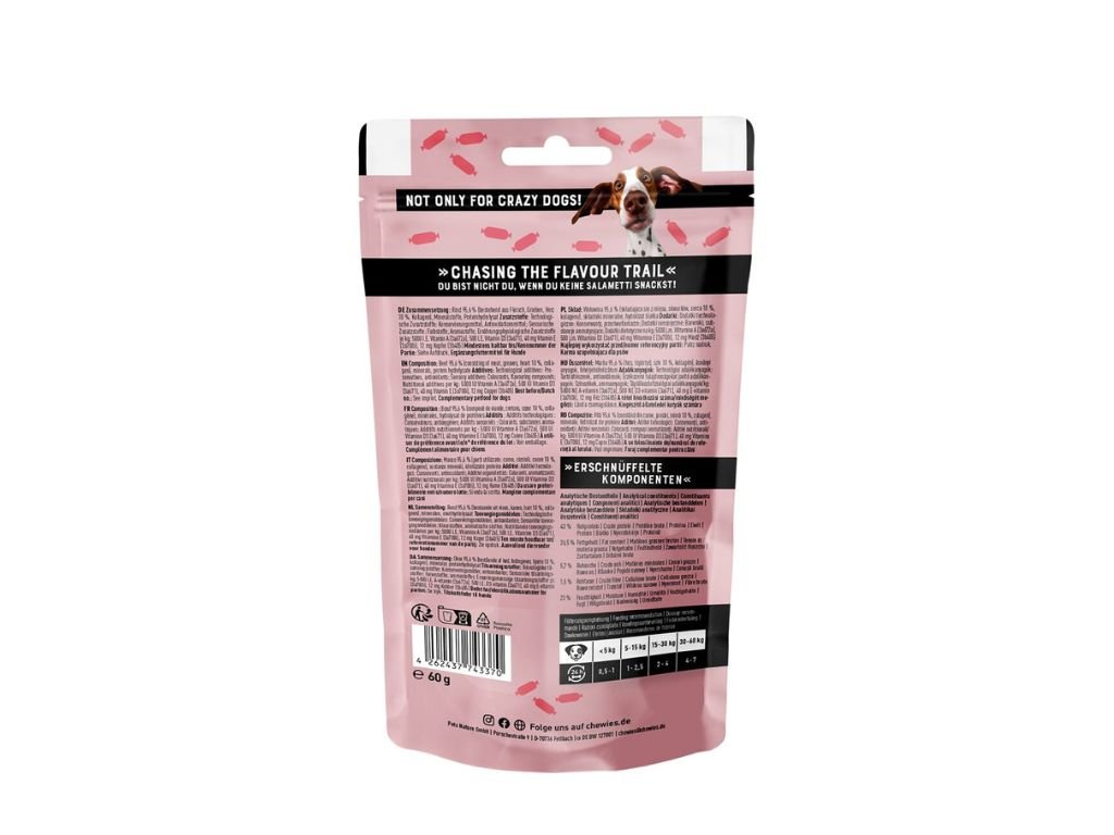 Salametti jsou malé salámky s intenzivní masovou chutí a vůní, které si váš mazlíček zamiluje! Jsou vyrobeny z přírodních surovin, šetrně sušených vzduchem, obsahují velký podíl masa (hovězí a sobí) a nenajdete v nich obiloviny ani přidaný cukr. Snadno je nalámete na menší kousky, což z nich dělá ideální tréninkový pamlsek a odměnu. Pochutnají si na nich pejsci všech věkových kategorií, přičemž díky vysokému obsahu proteinu a kolagenu jsou perfektní volbou i pro aktivní psy, kterým dodají potřebnou energii, ať na tréninku nebo jen cestách.