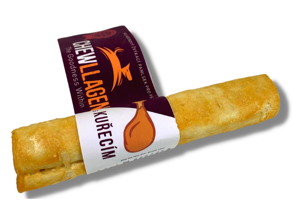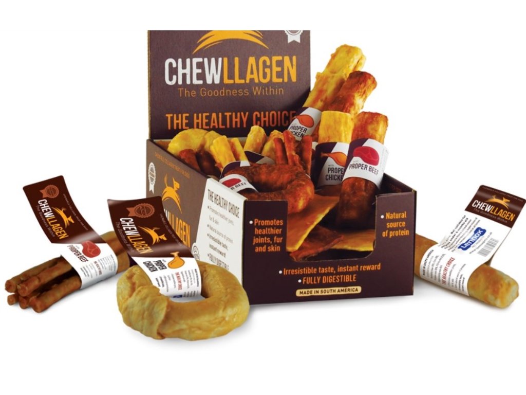 Pochoutky Chewllagen jsou ideální jako odměna, jíž psovi dodáte sílu a podpoříte jeho zotavení např. po delší procházce. Vyrábějí se z čistého kolagenu získávaného z kůže volně pasených jihoamerických krav. V procesu ohřevu jsou kolagenové bílkoviny hydrolyzovány a štěpí se na menší, snadněji stravitelné molekuly. Poté je kolagen vytvarován, upečen a nakonec dochucen skutečným hovězím nebo kuřecím. Pamlsky obsahují především kolagen typu 1 a 3, který stimuluje tvorbu různých tkání včetně chrupavčitých a podporuje tak zdraví kloubů, kůže, srsti i střev.