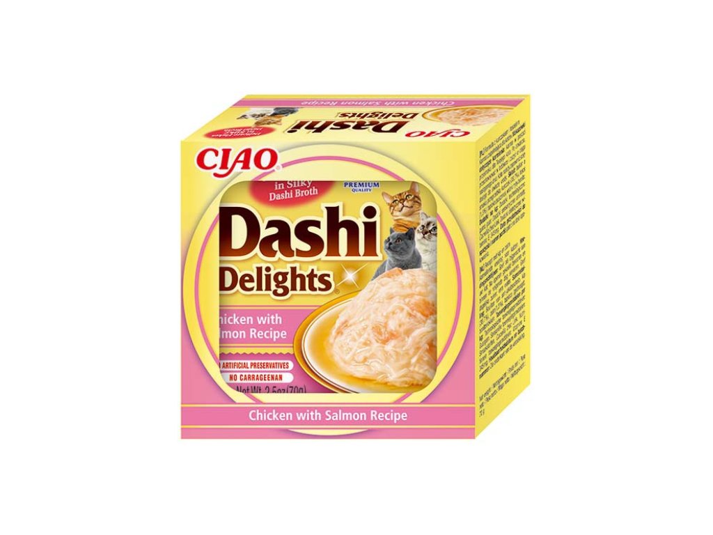 Inaba Churu Cat Dashi Delights kuře s lososem je doplňkové krmivo obsahující kuřecí maso s lososem určené pro kočky. Každý produkt Inaba je vyroben z lahodných vysoce kvalitních surovin, včetně kuřete chovaného na farmě nebo přírodního tuňáka uloveného ve volné přírodě. Vyrobeno z jemného vývaru vyrobeného ze sušeného kuřete (bonito vločky), smíchaného s kousky pečlivě vybraných prémiových proteinů, uvolňující novou úroveň chuti pro vaši kočku. Doplňte své krmivo pro kočky s hydratačním krmivem pro kočky, které je bez obilnin, bez konzervantů, bez karagenanu a bez umělých barviv. Čerstvé ingredience s přidaným vitamínem E pro podporu jejich imunitního systému a extrakt ze zeleného čaje jako přírodní antioxidant.