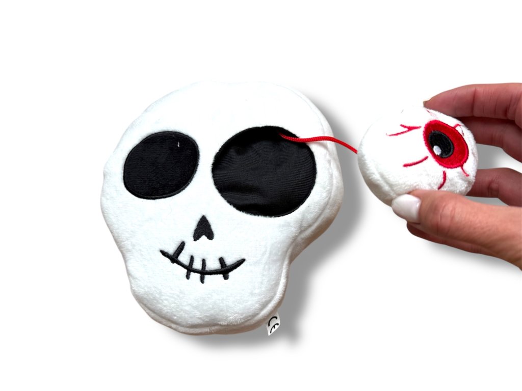 Halloweenská plyšová lebka s vypadávajícím okem.