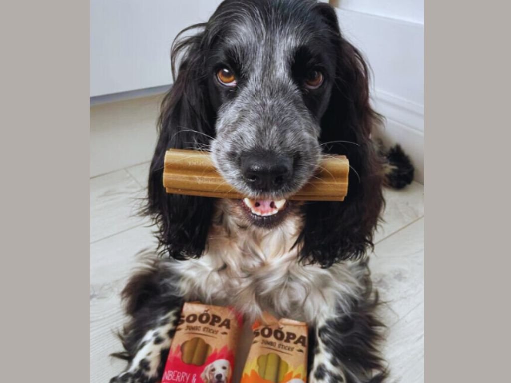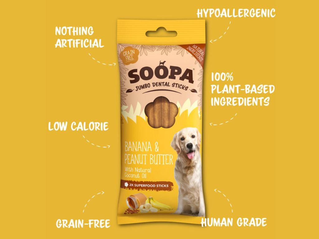 Tyčinky Soopa jsou 100% přírodní veganské pamlsky pro psy ke žvýkání. Pomáhají redukovat zubní plak, omezovat zápach z tlamy a snižovat riziko vzniku zubního kamene. Velikost Jumbo je větší verzí originálních Soopa tyčinek. Balení obsahuje dvě velké, silné tyčinky s otvorem uprostřed, které se hodí hlavně pro střední a velká plemena nebo pro psy, kteří si užívají dlouhé žvýkání. Jsou dost silné a pevné na to, aby pomáhaly vašemu mazlíčkovi čistit zuby a masírovat dásně, ale současně jsou dostatečně tvárné, aby nedocházelo k poranění uvnitř tlamy. Tyčinky Soopa jsou vyrobeny ze 100% přírodních surovin a koncipovány tak, aby svými nutričními hodnotami prospívaly celkovému zdraví psa. Neobsahují obiloviny, umělá barviva a dochucovadla, jsou nízkotučné a vhodné i pro alergické psy, psy s citlivým zažíváním nebo nízkoproteinovou dietou.