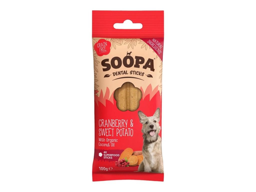Dentální tyčinky s brusinkami a batáty jsou přírodním veganským pamlskem pro psy ke žvýkání. Pomáhají redukovat zubní plak, omezovat zápach z tlamy a snižovat riziko vzniku zubního kamene a onemocnění dásní. Tyčinky Soopa jsou vyrobeny pouze ze 100 % přírodních surovin a koncipovány tak, aby svými nutričními hodnotami prospívali celkovému zdraví psa. Neobsahují obiloviny, umělá barviva a dochucovadla. Tyto pamlsky jsou skvělou alternativou k běžně dostupným dentálním pochoutkám, které často obsahují pouze blíže nespecifikované rostlinné produkty nízké kvality a zanedbatelných nutričních hodnot. Na rozdíl od nich je složení Soopa zcela transparentní a výživové hodnoty obsažených složek jsou pro psa přínosem.