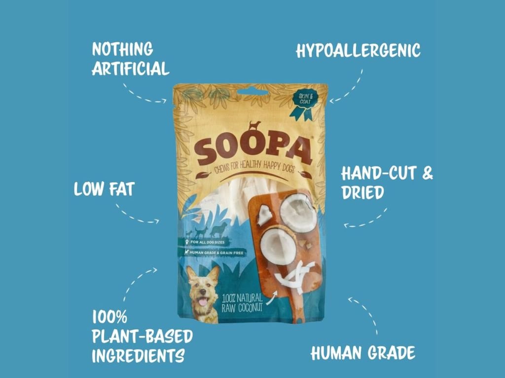 Množství podávaného pamlsku vždy přizpůsobte hmotnosti, aktivitě a celkové kondici psa. Zajistěte dostatek pitné vody. Soopa Chews jsou vhodné pro psy od 3 měsíců věku; bez dozoru doporučeno od 6 měsíců. K dostání jsou ve třech druzích: Papáju a batáty lze psům podávat i ve vyšším množství, kokos má však detoxikační účinky, proto by měl být podáván pouze v menším množství. Vzhledem k vyššímu obsahu vlákniny se mohou ve stolici objevit drobné nestrávené zbytky, což je běžné a neškodné.