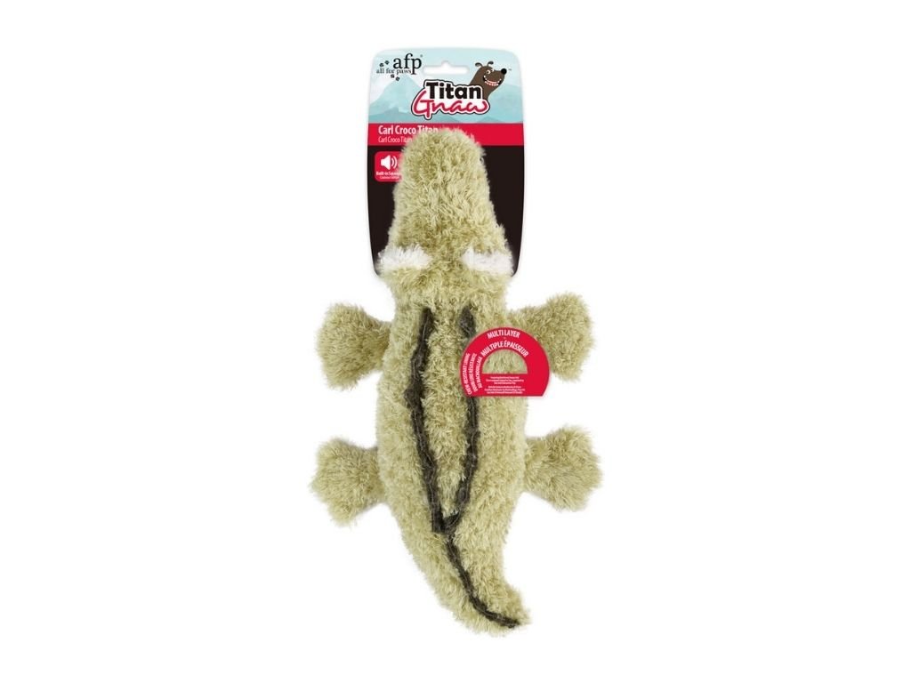 Krokodýl z kolekce Titan Gnaw je plyšový parťák pro pejsky, kteří si s hračkami rozhodně nehrají „na jemno“. Je navržený tak, aby vydržel i pořádnou psí akci – tahání, třepání i poctivé okusování. Zpevněné švy a odolná vnitřní vrstva dávají krokouškovi sílu, na kterou se můžete spolehnout. Na dotek je ale krásně hebký. Díky měkkému plyšovému povrchu se z něj snadno stane nejen hračka na dovádění, ale i mazlivý společník do pelíšku, ke kterému se váš chlupáč rád přitulí po náročném dni. Uvnitř se skrývá pískátko, které probouzí psí zvědavost, udržuje pozornost a podporuje přirozený lovecký instinkt. Každé zmáčknutí je malou výzvou k další hře – ať už společné, nebo klidně jen tak o samotě.
